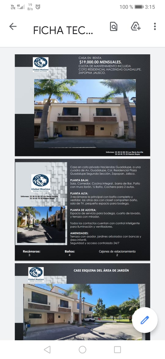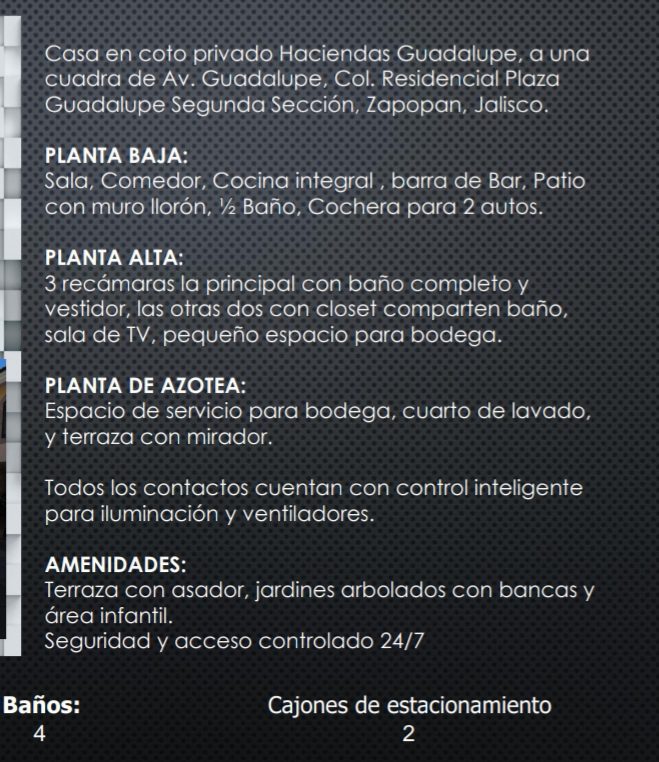 Tipo de propiedad - Casa Tipo de contrato - Renta Built-Up - 140 M 2 COTO ENCINO #47 Preciosa casa en RENTA!!! $11,000 mantenimiento incluido Domicilio, Prolongación Camino Nacional 1604, Luna Bosque, Zapopan, Jalisco Vive en la Ciudad pero no inmerso en ella, a unos minutos de Av. Lopez Mateos encuentras este Fraccionamiento con diversos Cotos en superficies bien planeadas y totalmente urbanizadas, con construcciones hermosas tipo minimalista, con areas verdes que invitan a vivir en la zona. Esta casa es prácticamente nueva, solo 2 años de antigüedad y esta a tu disposición! El coto cuenta con casa Club, una linda Alberca, y preciosas vistas al Bosque de la Primavera. Se aceptan mascotas. Descripción: Acceso controlado a través de TAG P.B. Cochera para 2 autos (abierta) servidumbre lateral y puerta de acceso trasera. Sala, comedor y cocina integral, con barra de granito, doble tarja, estufa, campana y amplias alacena de almacenaje, convenientemente el área de lavado queda en la parte de atrás de la cocina, en un amplio patio, para la optimización del tiempo de labor en casa, área para jardín. P.A. 3 recamaras, la principal tiene balcón, baño completo y vestidor, las otras dos recamaras comparten baño, toda la ventanearía es de aluminio anodizado en color blanco, también cuenta con tragaluz en la escalera, que permite una excelente iluminación de luz natural. Requisitos de interesado perfilados: Aval con propiedad libre de gravamen en la ZMG u Obligado Solidario Comprobantes de ingresos de 3 meses 1 mes de deposito 1 mes de renta Pago de investigación no reembolsable $1,000 (indispensable que todos los documentos sean de la persona que firmara el contrato) sujeto a aprobación, indispensable no estar en Buro de crédito. Pago del Convenio de Justicia Alternativa $3,000 Renta por año Quedamos a tus ordenes, nuestros asesores con gusto te atenderán! Tel. 33 21 70 49 49 Fecha agregada: 4 años hace Ver Detalles